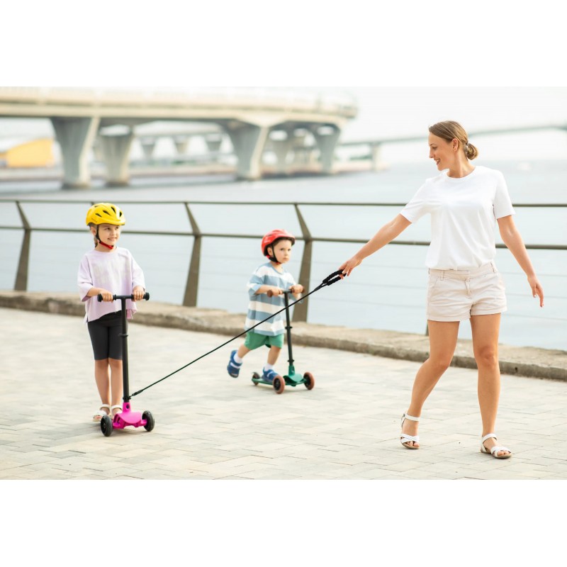 Но красота кроется в деталях, поэтому в комплекте с каждым самокатом идёт симпатичный звоночек, набор ярких наклеек и наша особенная фишка — быстросъемный шнур-буксир! Да-да, шнур-буксир на случай, когда юный исследователь устал. Буксир крепится к основанию руля с помощью быстросъемного карабина.